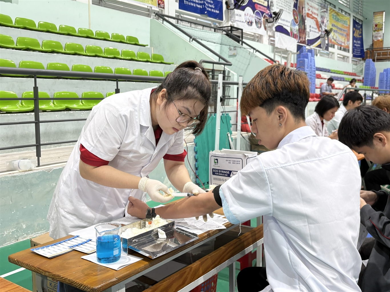 Sinh viên được kiểm tra sức khỏe và xét nghiệm máu trước khi tham gia hiến máu