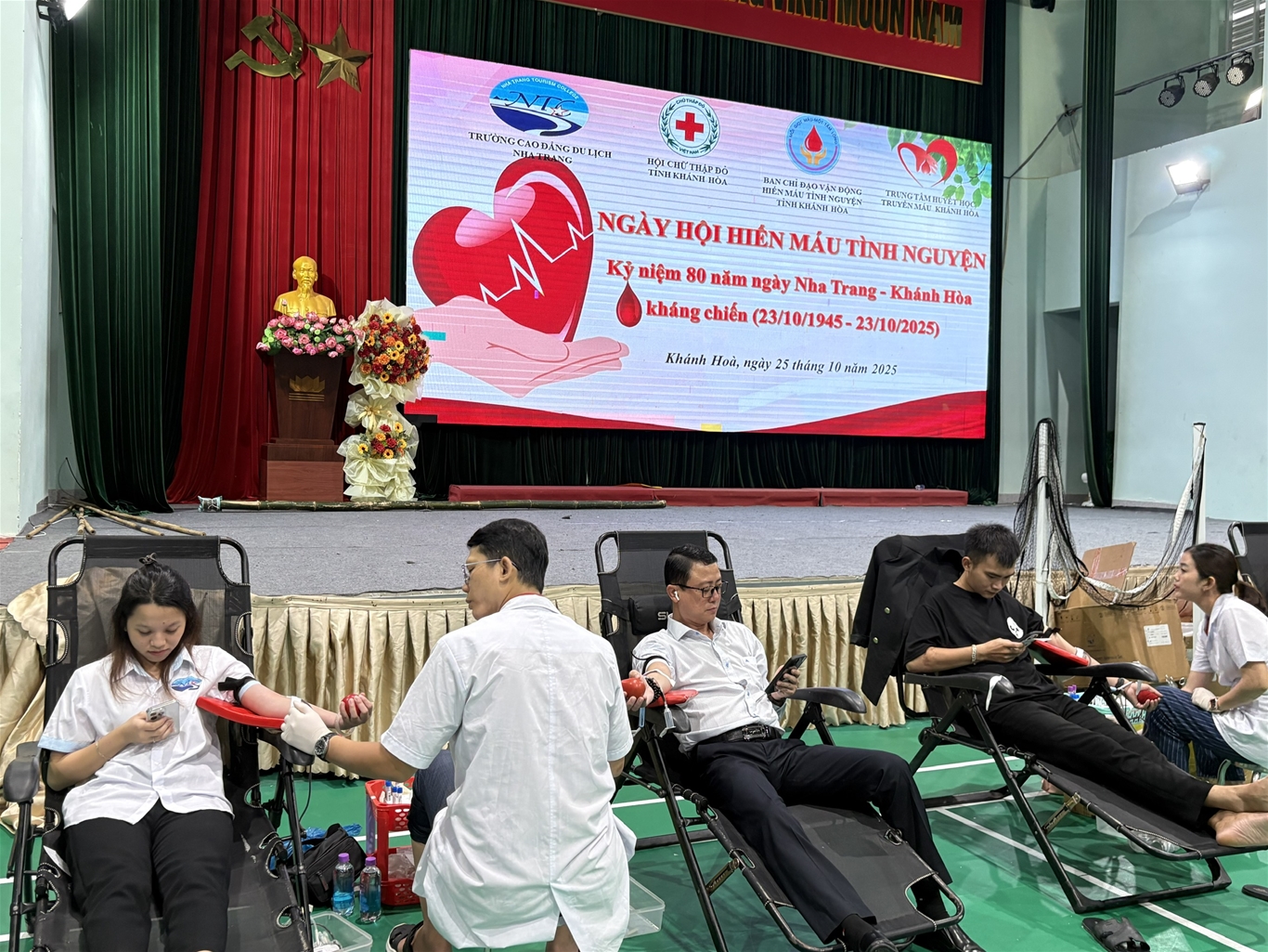 Sáng ngày 25/10/2025, Trường Cao đẳng Du lịch Nha Trang phối hợp cùng Hội Chữ thập đỏ tỉnh Khánh Hoà, Ban Chỉ đạo Vận động hiến máu tình nguyện tỉnh Khánh Hoà, Trung tâm Huyết học - Truyền máu tỉnh Khánh Hoà tổ chức Ngày hội Hiến máu tình nguyện kỷ niệm 80 năm ngày Nha Trang - Khánh Hoà kháng chiến (23/10/1945 - 23/10/2025).