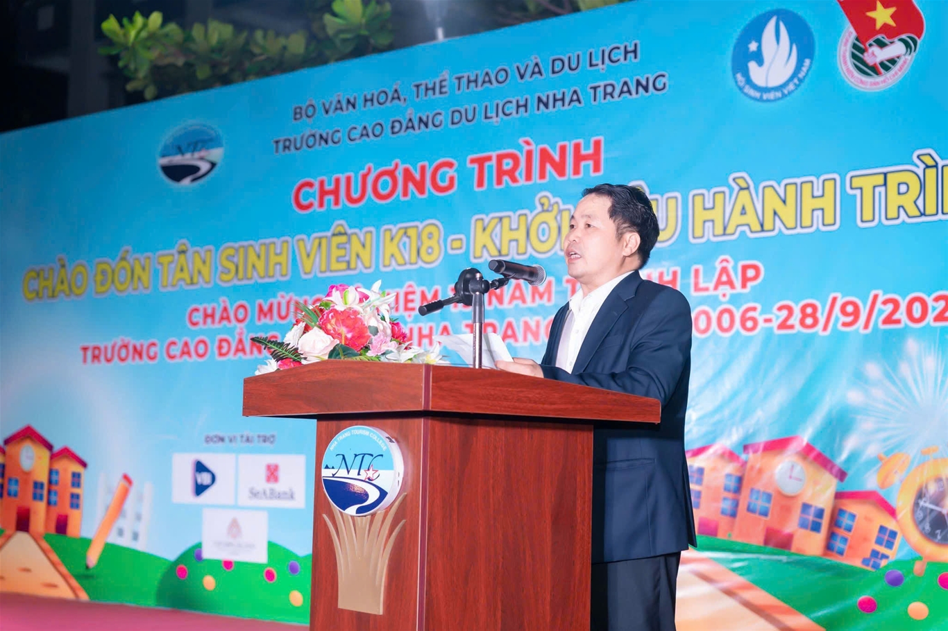 Phát biểu khai mạc chương trình, Thầy Nguyễn Doãn Thành – Bí thư Đảng ủy, Hiệu trưởng Trường Cao đẳng Du lịch Nha Trang đã gửi đến các bạn tân sinh viên lời chào đón nồng nhiệt, động viên tinh thần các bạn để bắt đầu một chặng đường mới học tập.